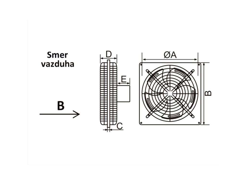 Kovový ventilátor větrá uzavřené prostory a eliminuje různé znečišťující látky. Směr vzduchu je výfuk. B - foukání. Vzduch prochází ochrannou sítí skrze vrtuli a vychází přes motor. Používá se v sacích a tlačných systémech.